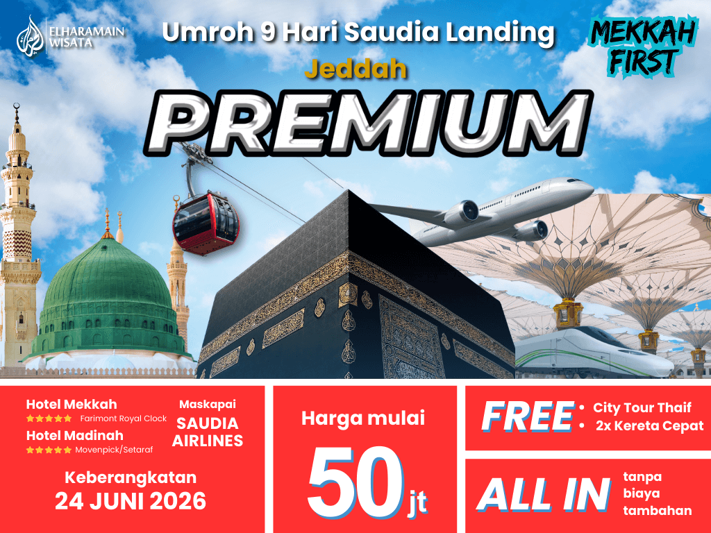Umroh PREMIUM 9 Hari Saudia Landing Jeddah + Thaif + 2x Kereta Cepat (24 Juni 2026) Makkah First