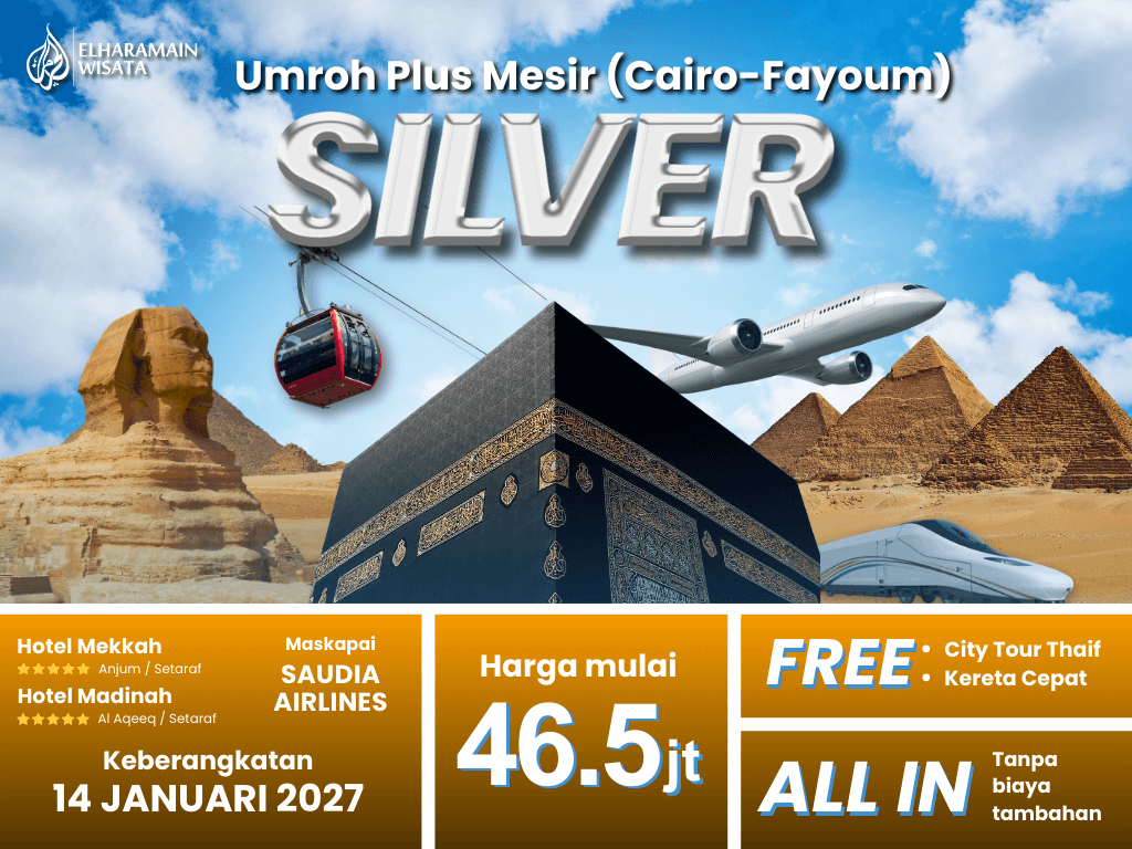 Umroh Plus Mesir (Cairo -Fayoum ) Saudia Landing Madinah + Thaif + Kereta Cepat (SILVER ) 14 Januari 2027