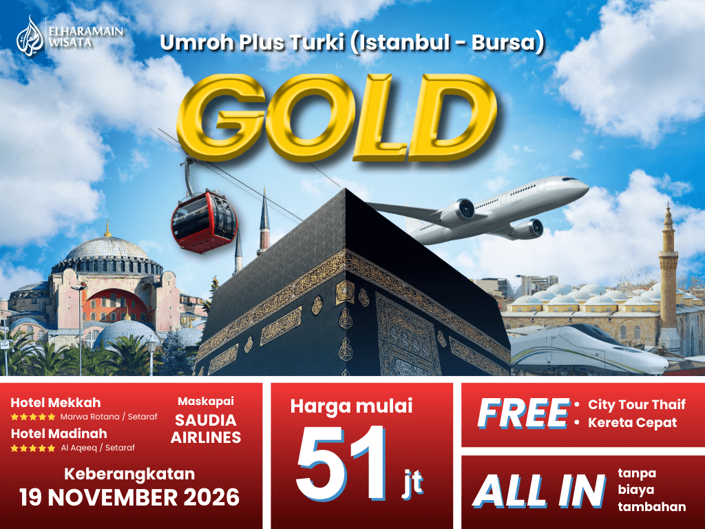 Umroh Plus Turki GOLD (Istanbul -Bursa ) Saudia Landing Madinah + Thaif + Kereta Cepat (19 November 2026)